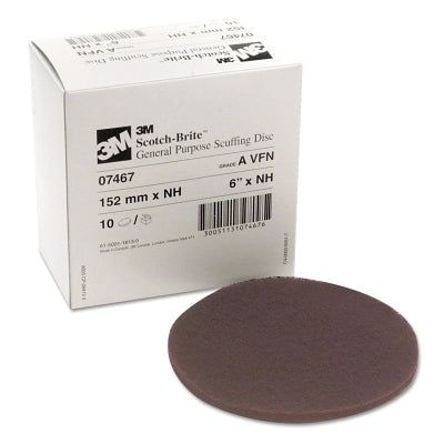 Abrasive Material = Aluminum Oxide, Abrasive Trade Name = Scotch-Brite, Applicable Materials = Aluminum; Stainless Steel; Plastics; Wood; Fiberglass, Applications = Scuffing, Arbor Diam [Nom] = No Hole, Arbor Thread - TPI or Pitch = No Hole, Color = Maroon, Dia. [Nom] = 6 in, Mounting = Hook-It Attachment System, Roughness Grade = Very Fine, Speed [Max] = 4,000 rpm, Style = Scuffing Disc, Type = Scuffing Disc. (10 EACH = 1 BOX)