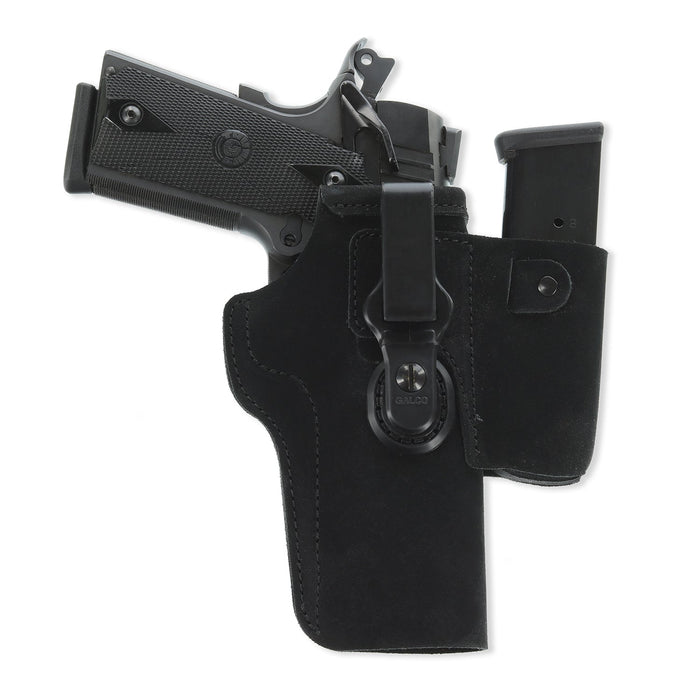 Part of Galco's Concealed Carry Lite line of holsters, the WalkAbout 2.0 offers all the benefits of the Tuck-n-Go 2.0 - with the addition of an attached spare magazine carrier! It's an exceptional combination of high performance, comfort and affordability. The WalkAbout 2.0's open top allows a very fast draw, while the reinforced mouth allows a smooth and easy return of the gun to the holster. The WalkAbout 2.0's belt clips are adjustable for cant, making it suitable for the strongside, crossdraw, or appendix carry positions. The ambidextrous WalkAbout 2.0 is supplied with two types of interchangeable tuckable clips. The first is the UniClip, designed to go over the belt, but which also works well without a belt. The second is the Ultimate Stealth clip with hook, which fits on the trouser waistband, under or behind a belt with just the clip showing, for the ultimate in stealthy concealment! Gun Fit - Springfield 3in 1911 w/Rail Gun Fit - Springfield 3in 1911 Gun Fit - Kimber 3in 1911 Gun Fit - Colt 3in 1911