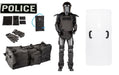 Patrol MP Riot Kit with Full MOLLE outer system- Front/Back/Sides. Riot Suit which includes, protectors for chest, back, shoulders, arms, thighs, groin, & shins all enclosed in a rollable backpack. Also included: 24" x 48" capture shield, with one decal, and carry bag, Front and back custom suit labels are also included.